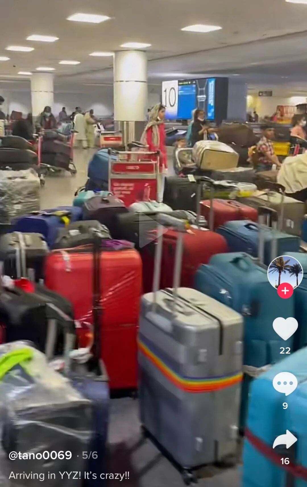抖音(TikTok)用户@tano0069 分享了多伦多皮尔逊国际机场3号航站楼的行李提取处的视频。视频里可以看到,堆积了“成吨”堆积如山的行李箱!