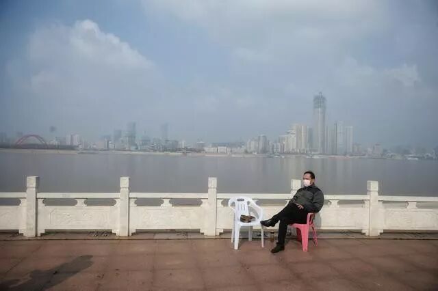 28日,一位武汉市民在江边晒太阳,图片来自红星新闻。