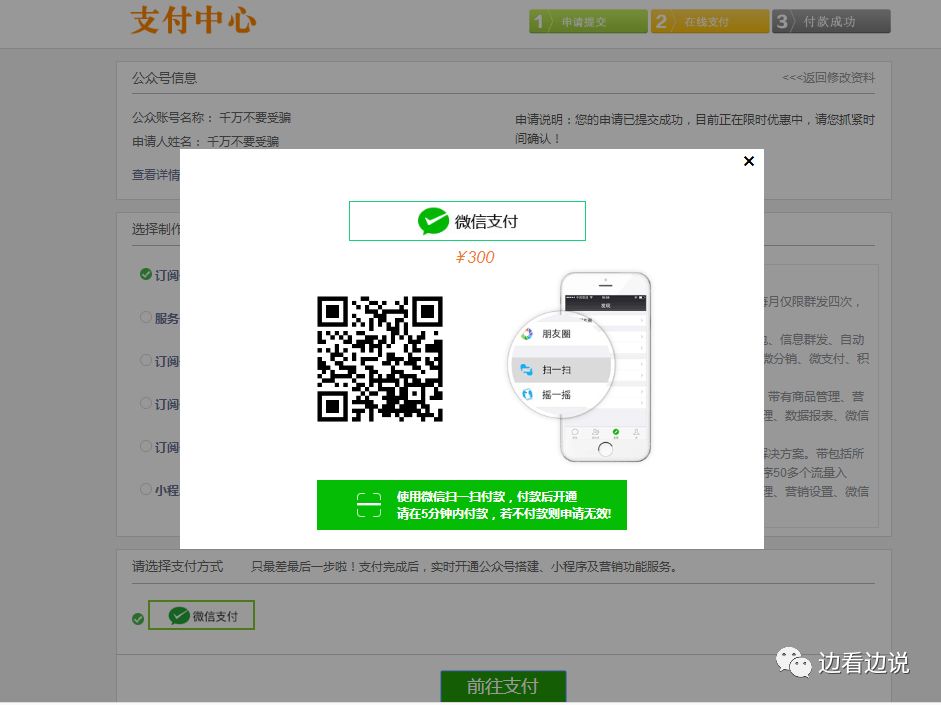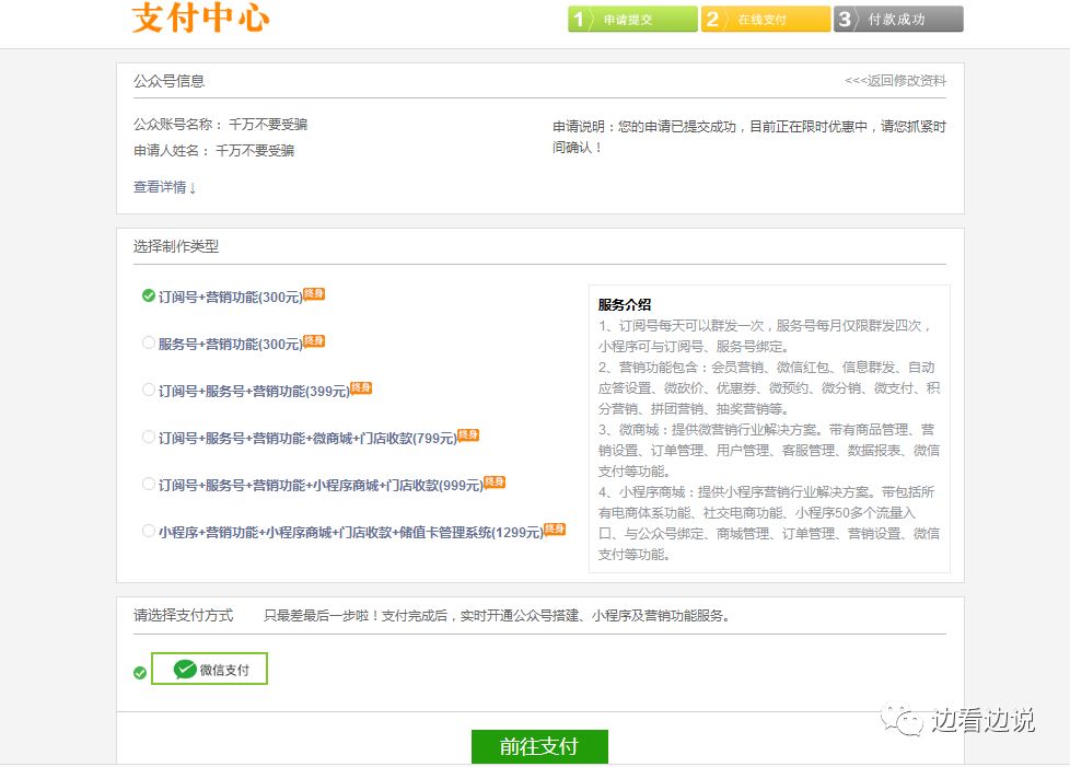 第四步,消费者通过搜索进入,误以为是官网,按提示一步步申请,虽然申请到了公众号,但是一般会损失300元。