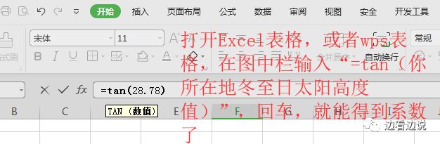 然后运用函数tan,在Excel表格或者WPS表格,就能算出楼高和影子的比值了。