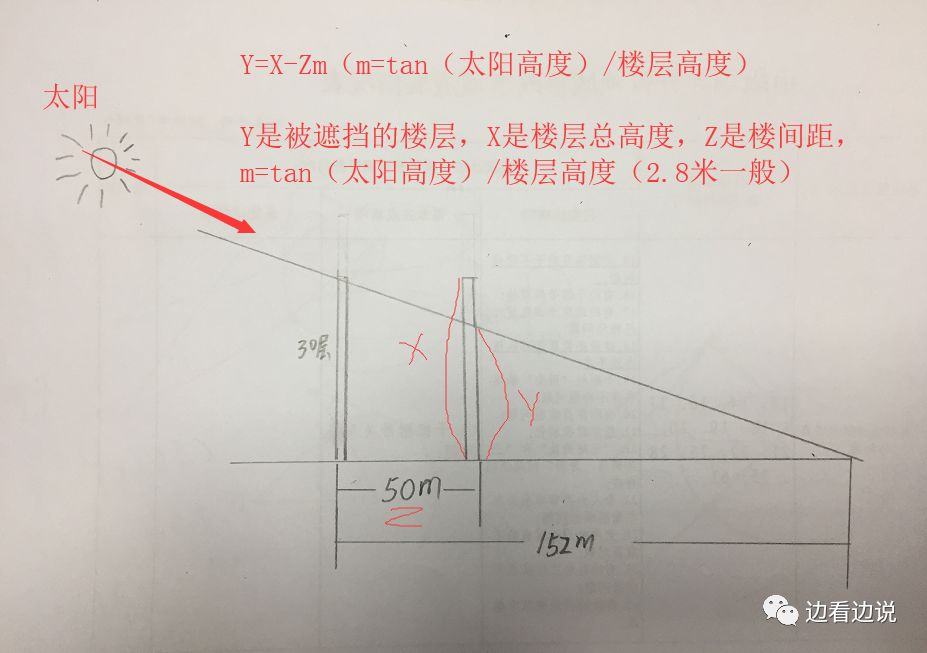 那么公式为:Y=X-Zm(m=tan(太阳高度)/楼层高度)