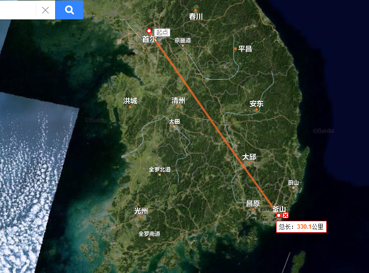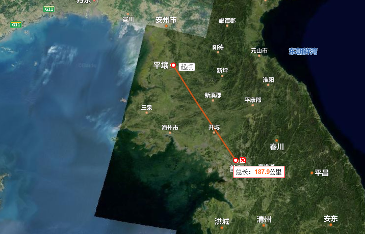 由于百度地图,对朝鲜的陆地路线规划未开放,只能拿尺子标注直线距离了,但是也足以让常人了解问题。