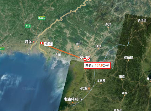 从龙川郡到电视剧《跨过鸭绿江》说的安州市,107.9公里,大概相当于北京外环到天津外环。