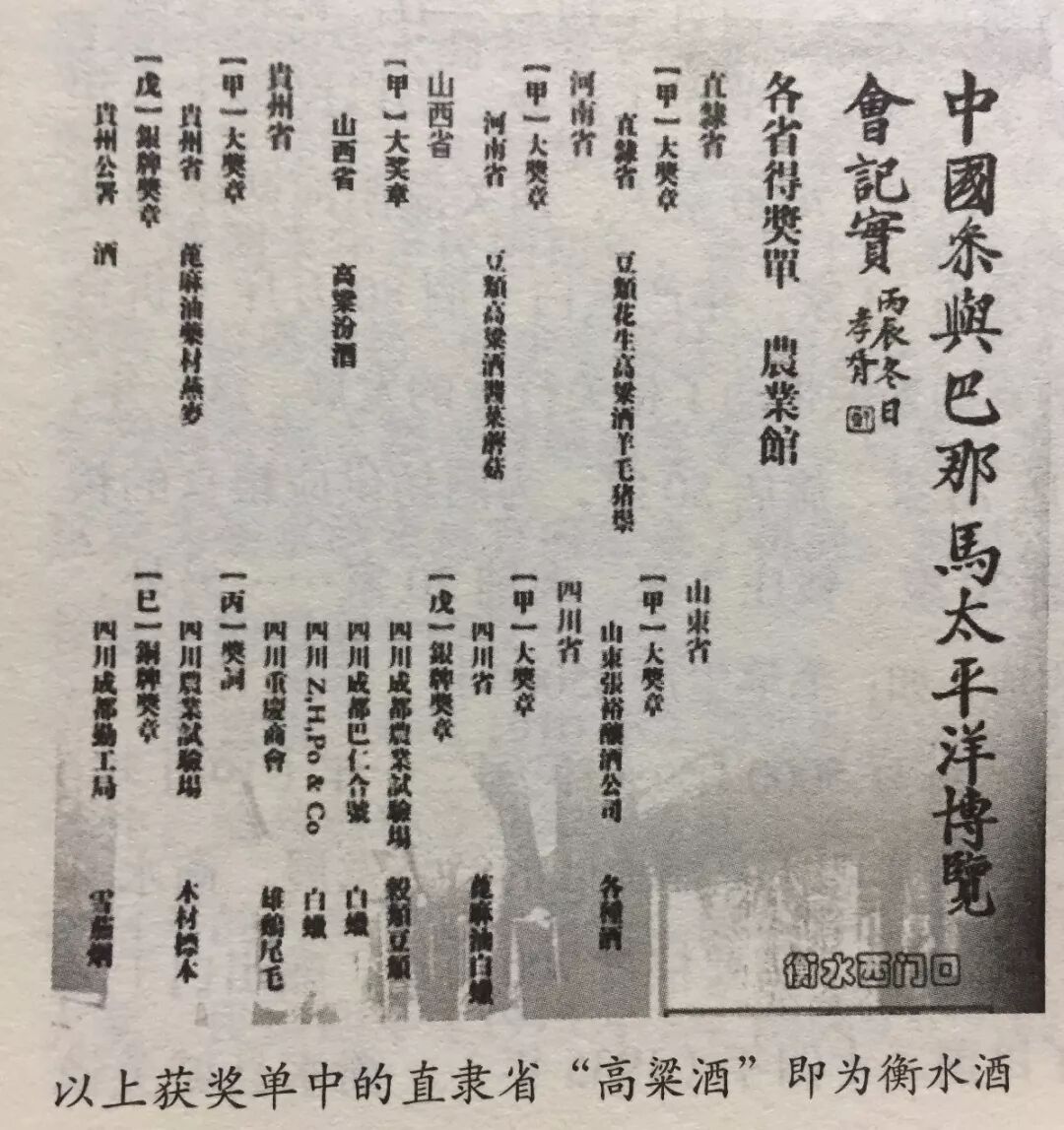 参加巴拿马太平洋博览会,因为远涉太平洋费用很高,衡水十八酒坊无一参会,直隶省府官员及夫人皆享受公费,他们仍携带“恒盛酒坊”的老白干酒,以“直隶高梁酒”(官厅)的名义参会,并荣获“甲等大奖章第一名”。