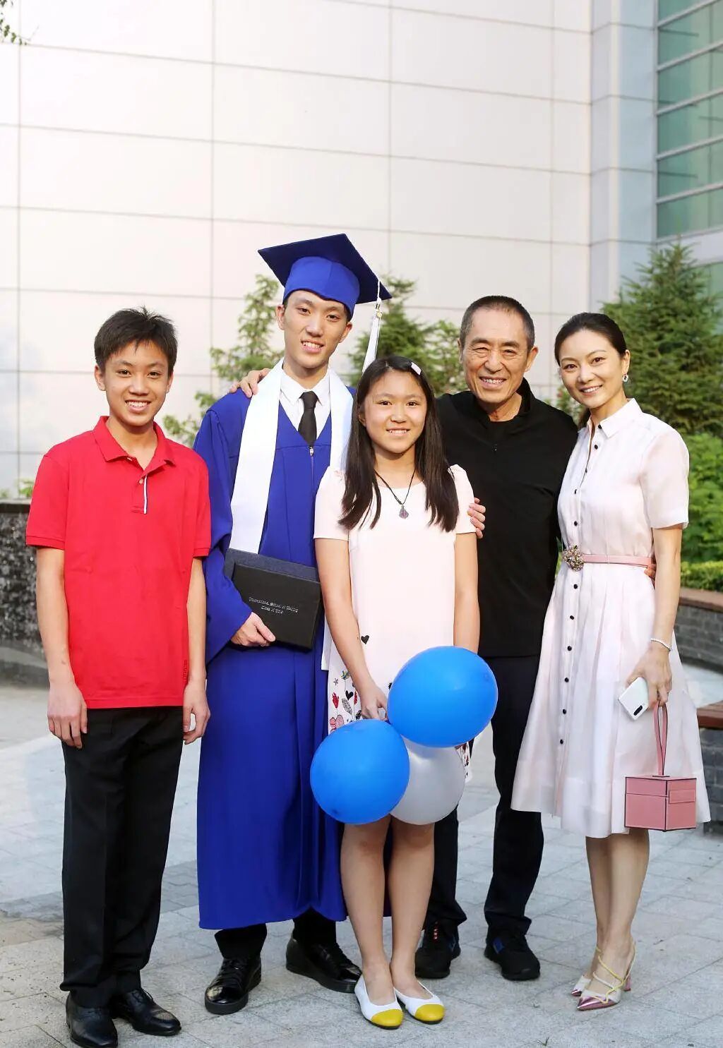 张艺谋与第二任妻子陈婷全家福。娃娃们都长大了。