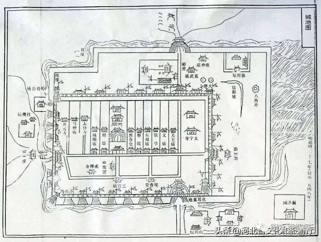 除了养正堂,鲁有开还在西门外漳河故道旁修建了避暑亭。该亭是据袁绍曾和幕僚在那里避暑的记载,在其原址修建。避暑亭在乾隆十一年(1746年)的《冀州五属舆地总图》上仍有标注,而养正堂则失载。我想,这或许是养正堂位于州衙内,而州衙每遇战火,总是首当其冲遭到攻击,以致堙灭无闻的缘故吧。从汉高祖六年(前201年)信都郡治迁到冀州再到明初的一千五百余年间,冀州基本上是郡、县或州、县两级治所,在曹魏、西晋和北魏,还是州、郡、县三级治所,辖区最大时管辖冀中南89个县。明清两代,取消信都县建制,只剩州建制。那些前代的郡衙、州衙、县衙,还有那些名目繁多的王府,都在剧烈的自然和社会变迁中,踪迹难寻。据明嘉靖二十七年(1548年)冀州城池图描绘,州衙在城内东西大街正中偏西的位置,正对一条南北胡同,胡同南头是三官庙,州衙东侧路北从西到东依次是预备仓、察院、东狱庙、儒学、文庙、关王庙,州衙西侧路北从东到西依次是府馆、城隍庙,如北宋到金元明时期的州衙没有易址的话,养正堂旧址当在这座州衙内或其附近。到了清代,明州衙或许是毁于战火,新州衙在明州衙的基础上又向西移,约在原府馆和城隍庙的位置,而城隍庙则东移到原州衙一带。