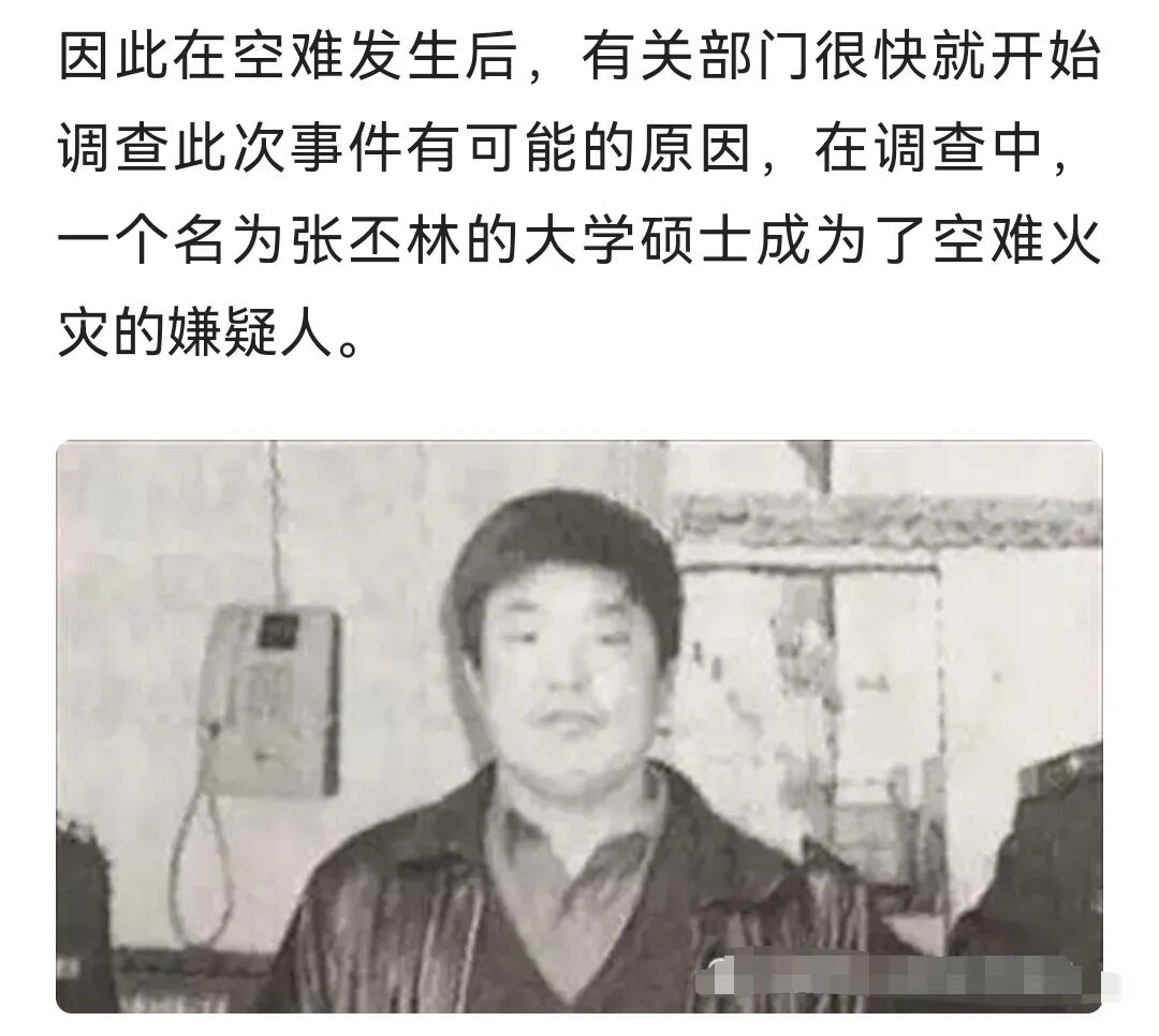 通过调查,并经周密核实,认定“5·7”空难是一起由于乘客张丕林纵火造成的破坏事件。在“5·7”空难罹难的103名乘客中,只有44名乘客购买了航空旅客人身意外伤害保险(以下简称航意险),其中有一人购买了7份,赔偿金额达100多万元,此人就是张丕林。