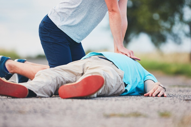 急救者在确认周围的环境安全之后,应使患者处于水平仰卧位(平躺着),躺在硬的地板上,轻拍患者的肩膀,大声呼叫患者的名字或者询问患者“你还好吗?”,并同时检查患者的呼吸情况(对于非医务人员的普通人来说,并不需要进行脉搏跳动的检查)。如果患者没有应答,并且已经没有呼吸或者只有喘息,应该立即拨打120,并开始心肺复苏的准备。如果患者有呕吐症状,应该将患者的头偏向一侧,除去口腔和气道内的呕吐物,如果患者口腔内有假牙等异物,也应该一并除去。