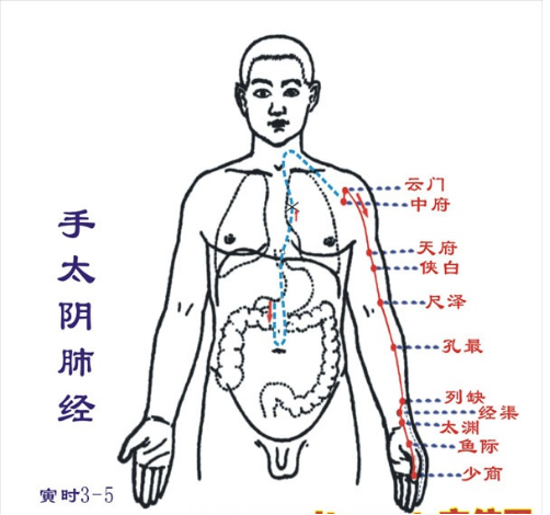 起于中焦(膈以下至脐的上腹部),向下联络大肠,回绕过来沿着胃的上口,通过横膈,属于肺脏,从“肺系”(肺与喉咙相联系的部位)横行出来(中府),向下沿上臂内侧,行于手少阴经和手厥阴经的前面,下行到肘窝中,沿着前臂内侧前缘,进入寸口,经过鱼际,沿着鱼际的边缘,出拇指内侧端(少商)。