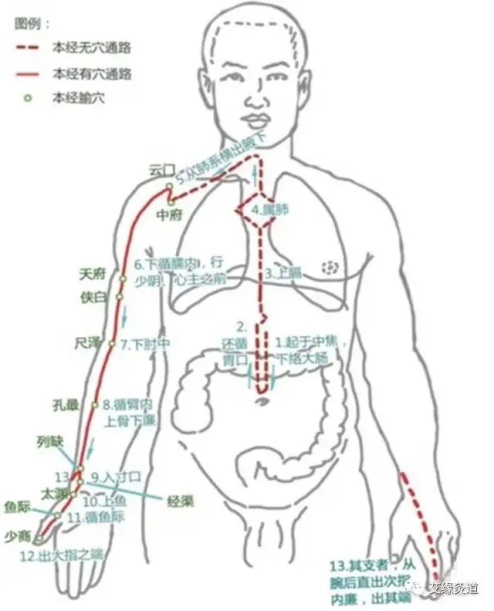 共有11个穴位:中府穴、云门穴、天府穴、侠白穴、尺泽穴、孔最穴、列缺穴、经渠穴、太渊穴、鱼际穴、少商穴。(标红者为较为重要的穴位)