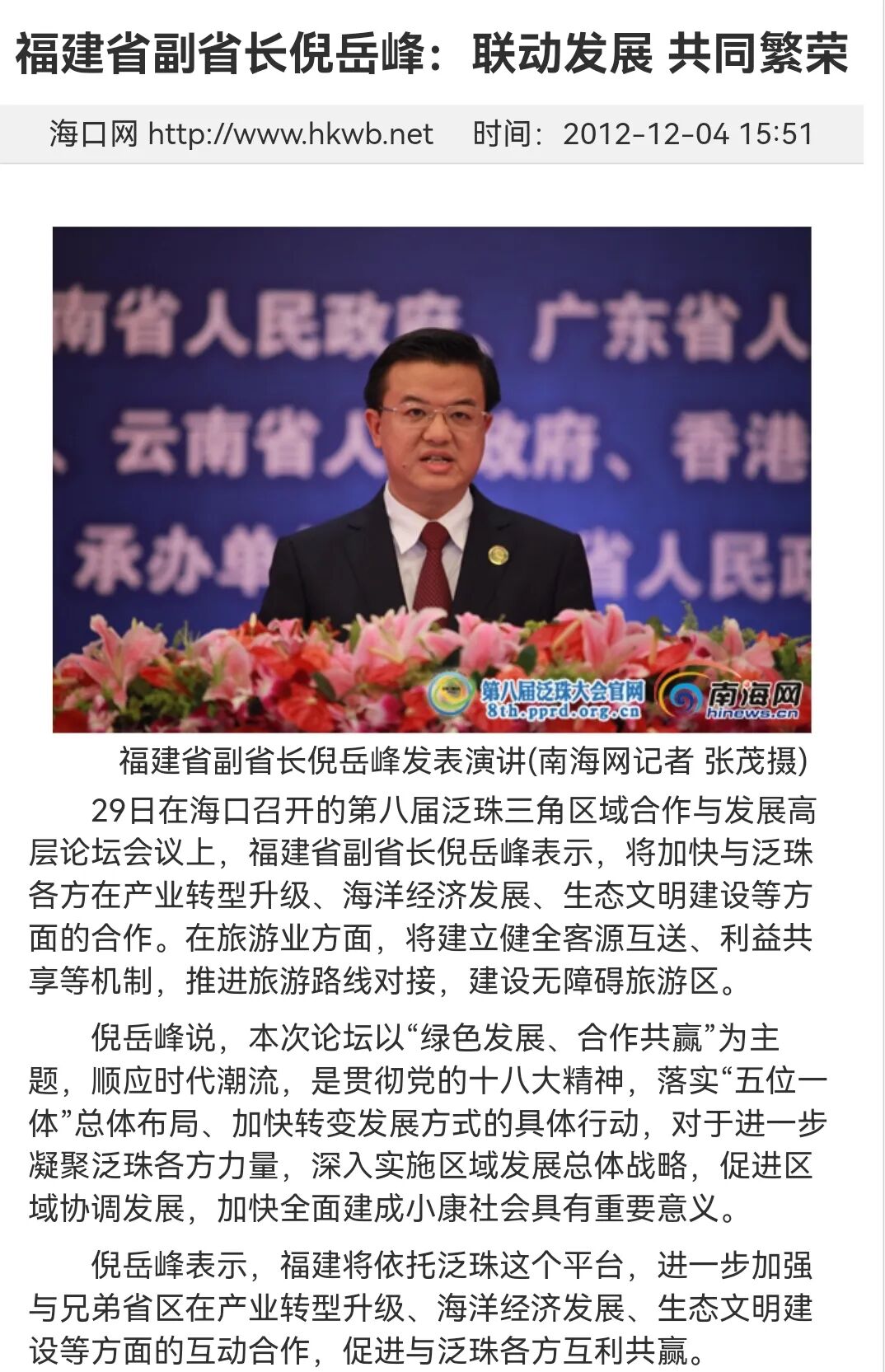 在2012年11月在海口召开的第八届泛珠三角区域合作与发展高层论坛会议上,时任福建省副省长倪岳峰发表主旨演讲,倪当时脱稿演讲,表达的内容和层次相当清晰,受到在场人士的广泛好评。