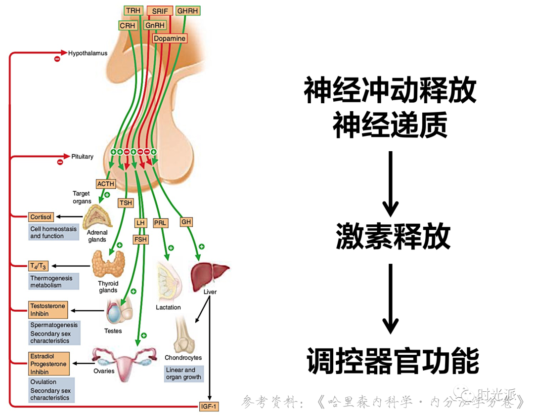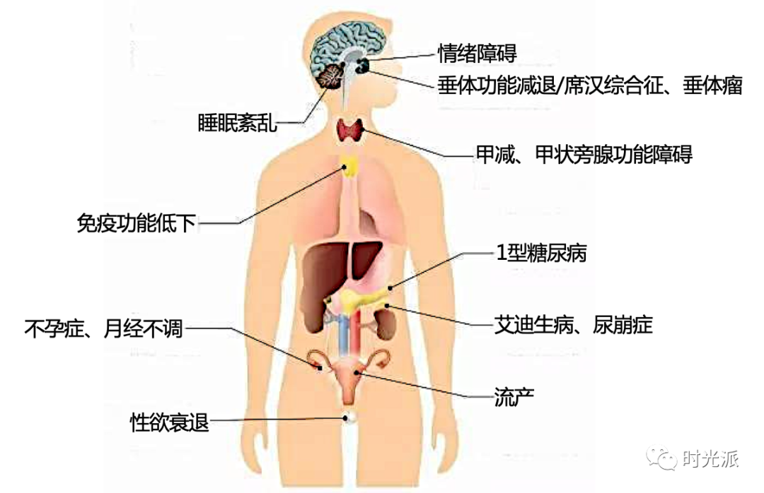 从而治疗:甲状腺素不足引起的甲减,垂体生长激素不足引起的侏儒症,性激素不足导致的性欲减退、不孕不育,瘦素、饥饿素分泌紊乱所致的肥胖,以及松果体褪黑素不足引起的睡眠障碍,神经递质紊乱引发的神经-精神疾病等等等等!