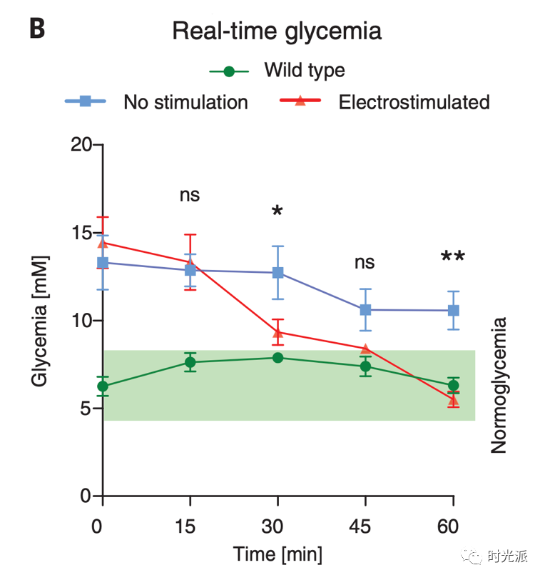 本研究这款智能芯片起效时间也与之非常接近:打开发射器仅10分钟,小鼠体内芯片便被激活,15分钟后,小鼠血糖开始下降。