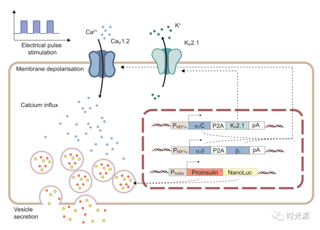 本研究所用的人工β细胞则无需上述复杂的“环境要求”,芯片释放指令后直接引起钙离子内流,随后人工细胞分泌胰岛素。