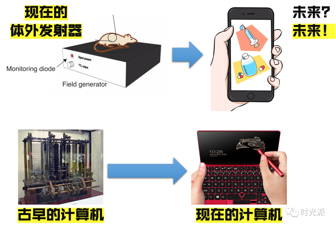 来进行一次不完整的“畅想”!升级版的发射器,可直接省去笨重的“遥控板”,将程序写入手机APP,只需开启或关闭该APP,就可一键调控体内多种激素。