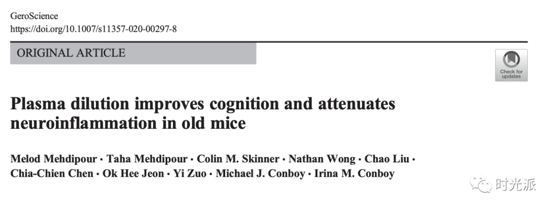 [4]. Mehdipour, M., Mehdipour, T., Skinner, C.M. et al. Plasma dilution improves cognition and attenuates neuroinflammation in old mice. GeroScience (2020). https://doi.org/10.1007/s11357-020-00297-8