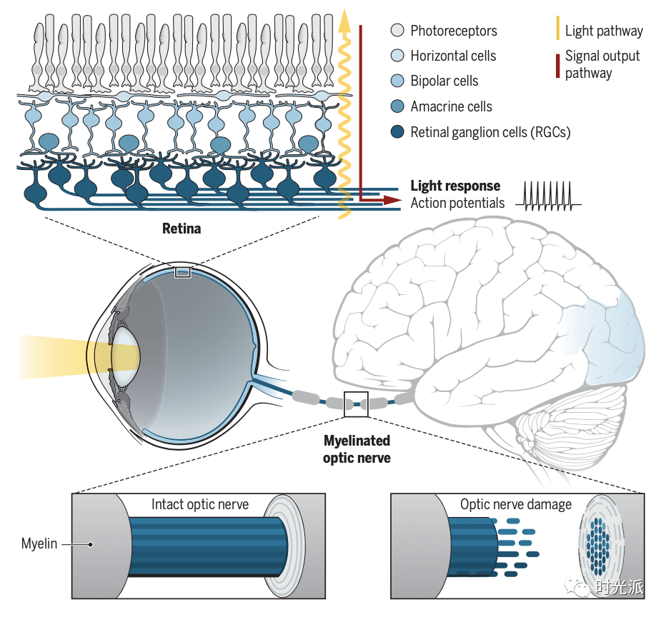 要验证这件事,天下可能没有比视网膜节细胞更好的模型了。这种构成我们视网膜的神经细胞,在出生几天后就会失去自己的再生能力,而且一旦受到损伤,基本就是不可逆的失明[7]。