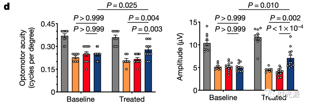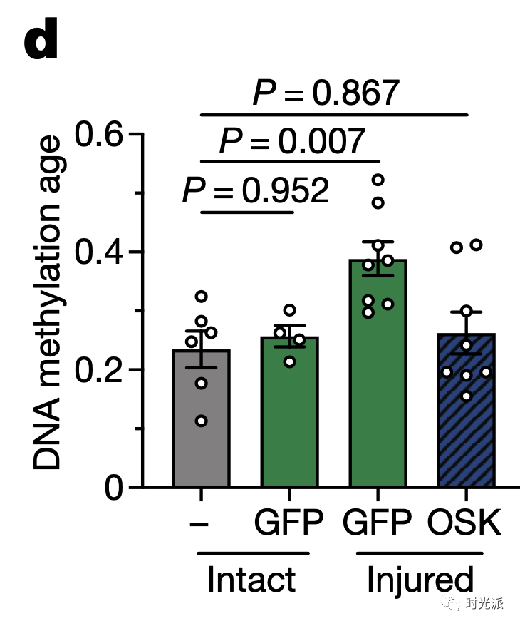 研究人员发现,12个月大的中年小鼠,在接受了4周OSK治疗后,视网膜节细胞中近90%因衰老而表达异常基因被恢复到了年轻水平,甲基化生理年龄检测也显示,小鼠的生理年龄时钟,正在反向转动。