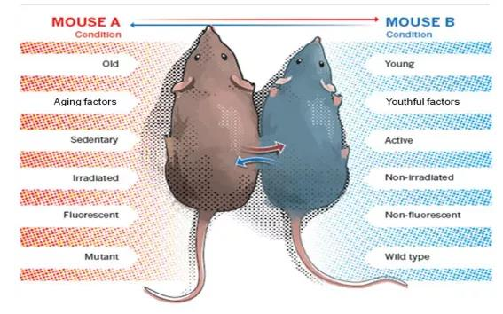 为了探究血液和衰老是否存在某种关联,加州大学伯克利分校的Conboy夫妇(Irina Conboy &Michael Conboy)做了一个弗兰肯斯坦式的疯狂实验:将年轻小鼠和衰老小鼠从侧边切开,把血管系统连接后缝合在一起。[1]