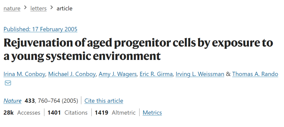 按理来说,随着科学进步,人们应该从蒙昧的血液迷信中清醒过来,但事实恰恰相反。科学不仅没有消解血液的魔力,反而阴差阳错地推动了换血风潮的兴起:2005年,发表在顶级科研期刊《Nature》上的研究发现,年轻老鼠的血液能让老年小鼠“返老还童”。[1]