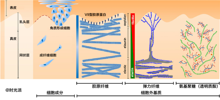 ③以致密结缔组织成分为主的真皮乳头层,为了补表皮层细胞和真皮网状层胶原/弹性纤维缺失的位置,不断增厚;