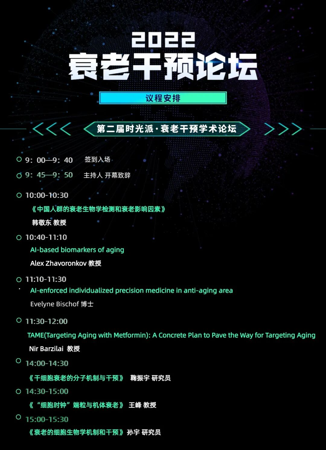 除王峰教授外,我们还非常有幸的邀请到了人类第一个“长寿药”临床的主持者Nir Barzilai博士,华人著名抗衰老学者、新生理时钟发现者北大学者韩敬东教授,史上最强衰老细胞清除剂发现者孙宇研究员,衰老研究AI公司CEO Alex Zhavoronkov教授等一众大咖,分享衰老研究的最新进展。