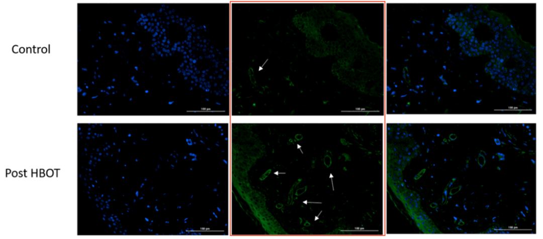 高压氧治疗后,毛细血管数目较前增加了约40%。