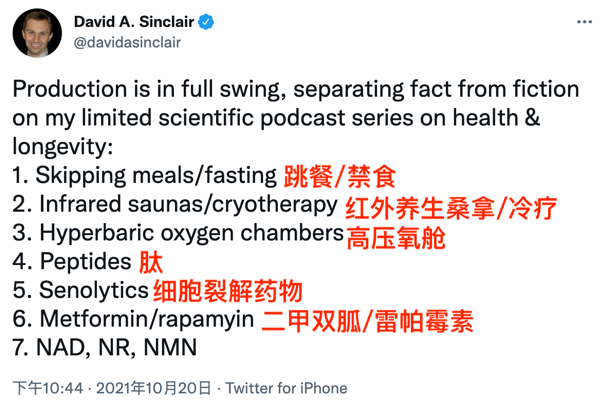 作为抗衰行业的风向标人物,“抗衰教父”哈佛大学的大卫·辛克莱一举一动备受关注。前不久,他在社交媒体上公布了自己的7条抗衰秘方: