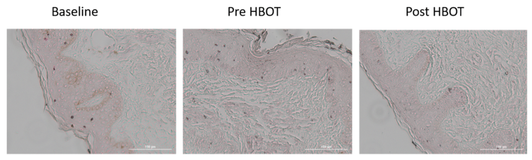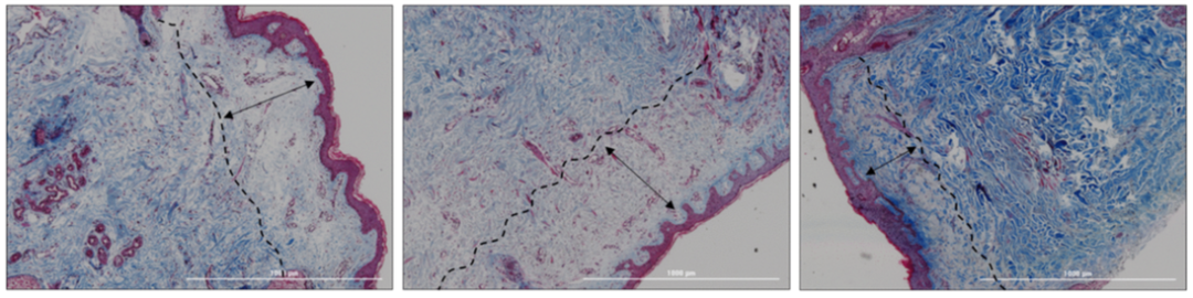 为了补齐衰老造成缺失的位置,反应性增厚的真皮乳头层,在经过高压氧治疗后,从基线133.22±22.42μm回缩至106.60±31.01μm。