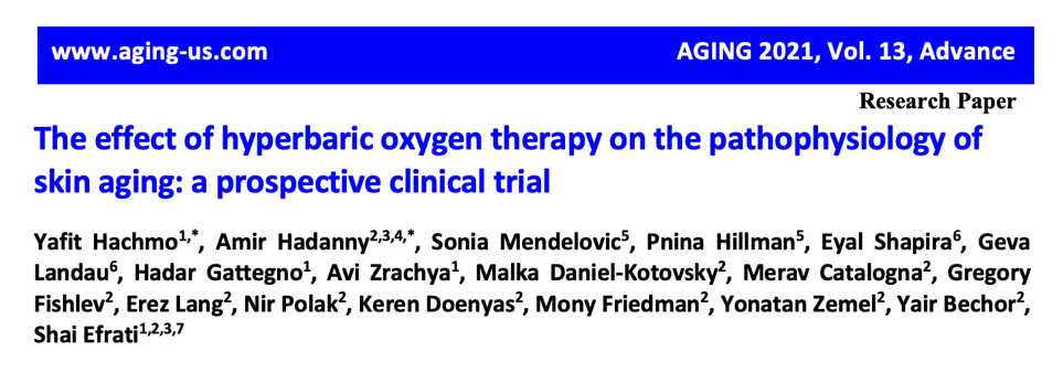 [2] Hachmo Y, Hadanny A, Mendelovic S, Hillman P, Shapira E, Landau G, Gattegno H, Zrachya A, Daniel-Kotovsky M, Catalogna M, Fishlev G, Lang E, Polak N, Doenyas K, Friedman M, Zemel Y, Bechor Y, Efrati S. The effect of hyperbaric oxygen therapy on the pathophysiology of skin aging: a prospective clinical trial. Aging (Albany NY). 2021 Nov 16;13(undefined).