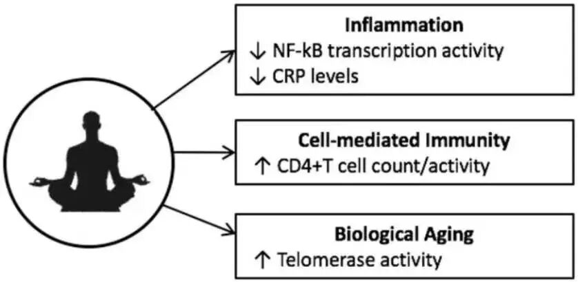 冥想不仅可以减少引发炎症的活性氧,而且四项分别在1996年、2007年、2008年、和2016年进行的实验都发现冥想可以减少一种叫NF-κB的免疫控制因子的活动,同时降低体内炎症因子含量,改善炎性衰老[9]。