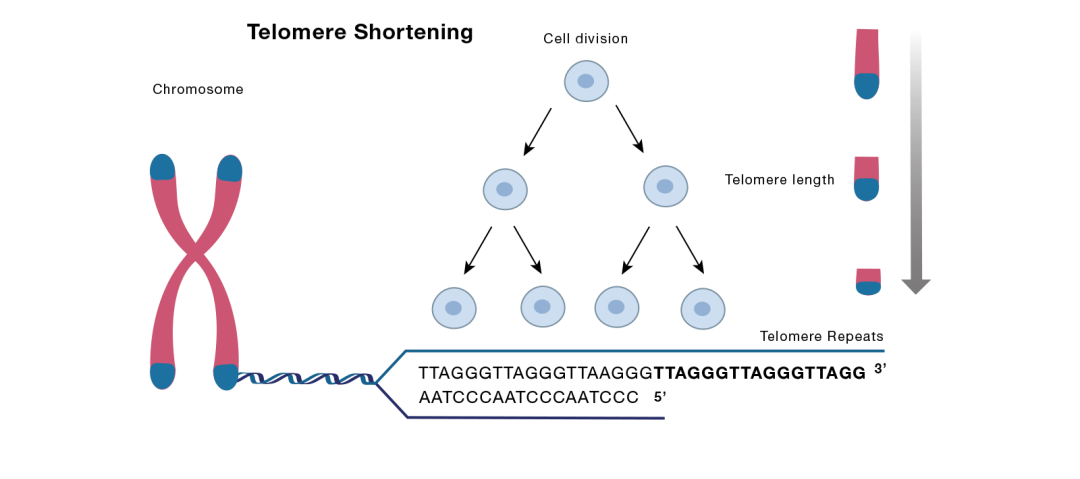 图注:端粒(telomere)位于染色体两端,长度随细胞分裂减少