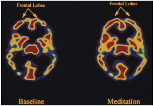图注:一张神经影像图,可以看出冥想时前额叶的活跃区域明显不同