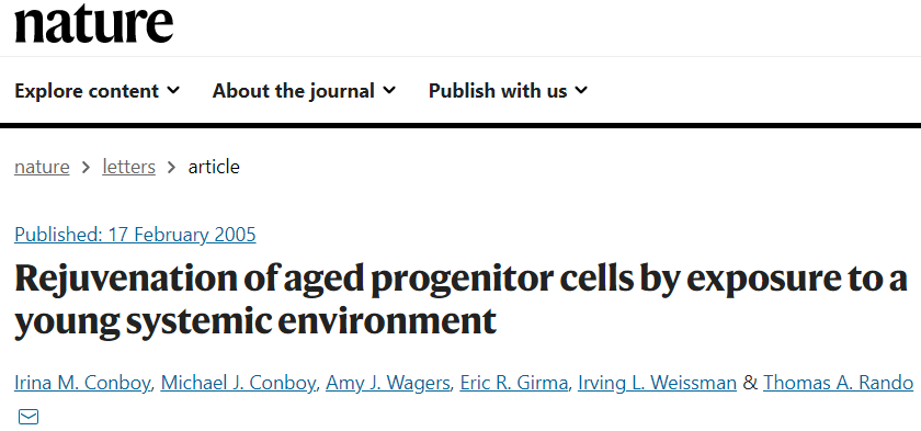 [1]Conboy, I. M., Conboy, M. J., Wagers, A. J., Girma, E. R., Weissman, I. L., & Rando, T. A. (2005). Rejuvenation of aged progenitor cells by exposure to a young systemic environment. Nature, 433(7027), 760–764. https://doi.org/10.1038/nature03260