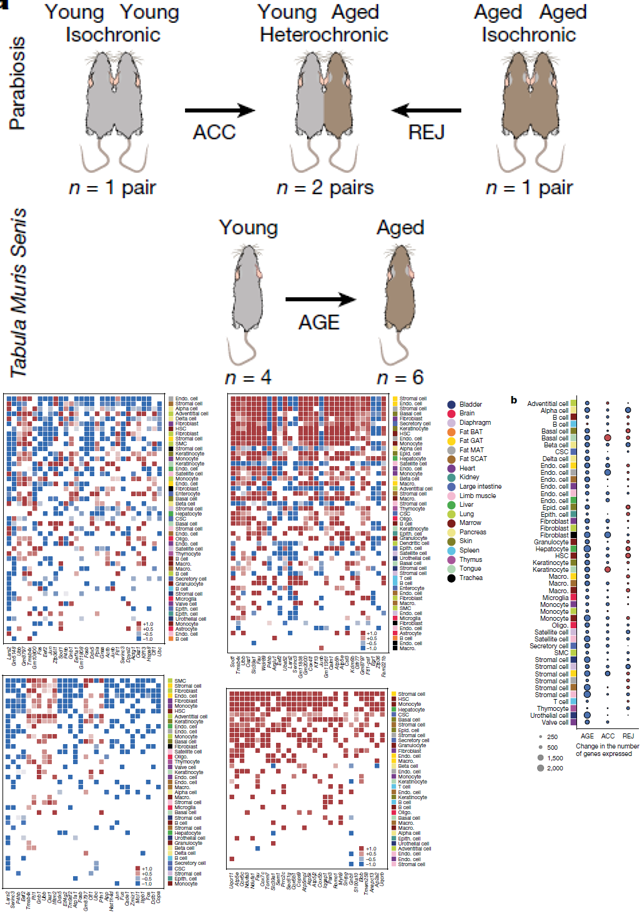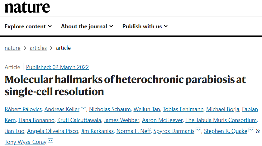 [5]Pálovics, R., Keller, A., Schaum, N., Tan, W., Fehlmann, T., Borja, M., Kern, F., Bonanno, L., Calcuttawala, K., Webber, J., McGeever, A., Tabula Muris Consortium, Luo, J., Pisco, A. O., Karkanias, J., Neff, N. F., Darmanis, S., Quake, S. R., & Wyss-Coray, T. (2022). Molecular hallmarks of heterochronic parabiosis at single-cell resolution. Nature, 10.1038/s41586-022-04461-2. Advance online publication. https://doi.org/10.1038/s41586-022-04461-2