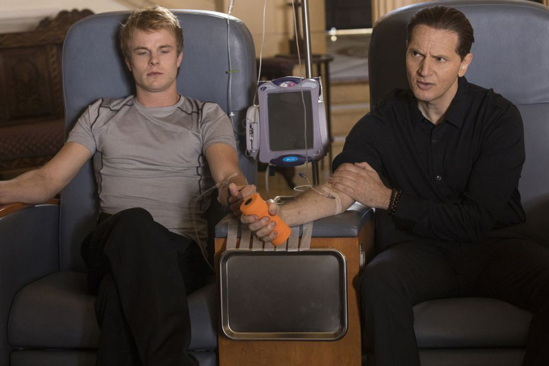 图注:美剧《硅谷》第四季第五集,富豪一边开会一边接受年轻运动员输血,网传是影射PayPal创始人彼得·泰尔