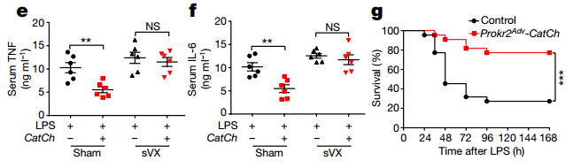 然而,当阻断足三里附近神经元群中PROKR2神经元后,重复上述试验却“奇迹不再”,除非是用6倍强度的高电流……但若不经足三里、直接激活PROKR2神经元,不仅出现与电针足三里相同的效果,甚至还要更好——充分驱动迷走神经-肾上腺素能神经轴,还能炎症下调50%+延寿50%。