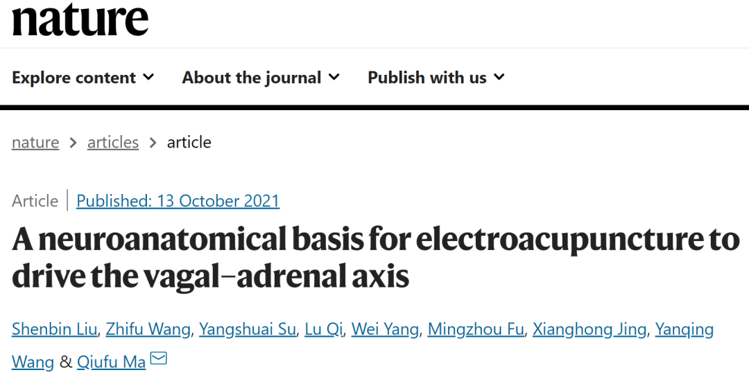 [12] Liu, S., Wang, Z., Su, Y., Qi, L., Yang, W., Fu, M., Jing, X., Wang, Y., & Ma, Q. (2021). A neuroanatomical basis for electroacupuncture to drive the vagal-adrenal axis. Nature, 601(7893), E9. https://doi.org/10.1038/s41586-021-04290-9