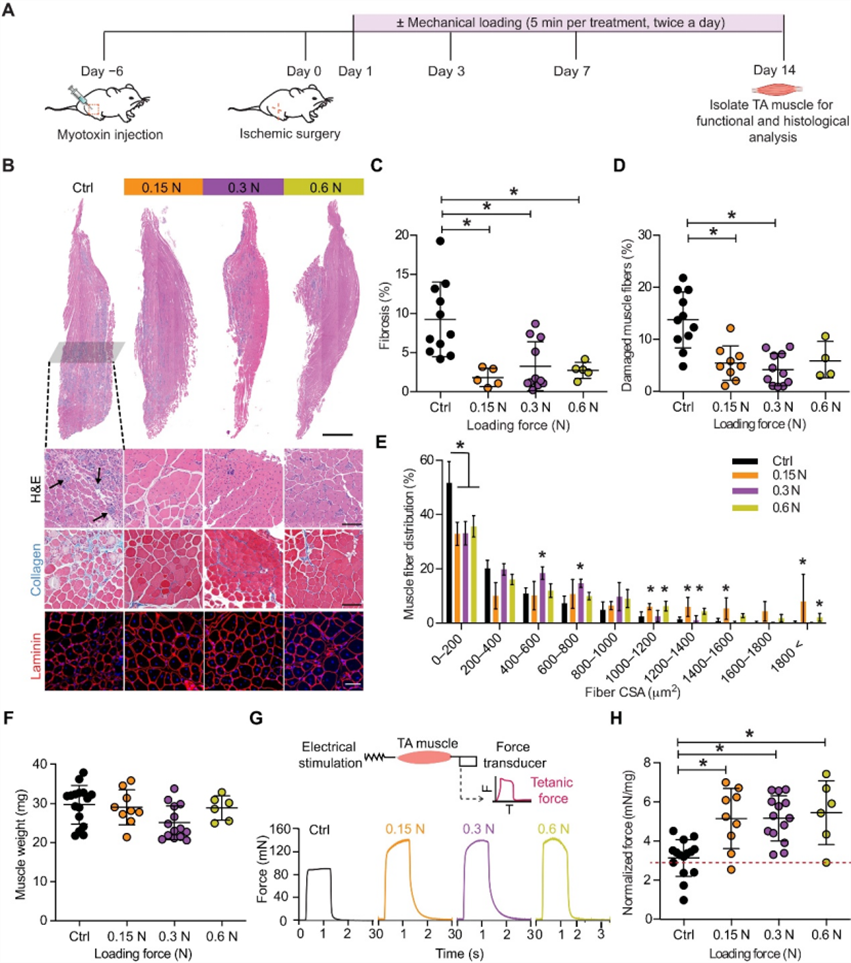 借助特定设备对小鼠严重肌肉损伤的胫骨进行按摩治疗,2周后,当再度检测肌肉状态时,学者们发现,被按摩的肌肉无论是组织形态,还是功能,都得到了明显恢复:纤维化程度显著降低、肌纤维变得更粗;电刺激下也表现出更强的收缩力。