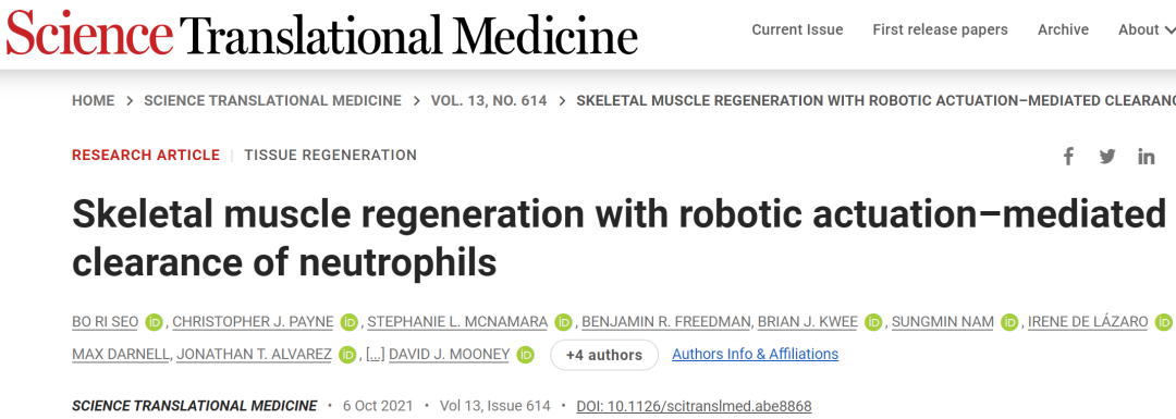 [10] Seo, B. R., Payne, C. J., McNamara, S. L., Freedman, B. R., Kwee, B. J., Nam, S., de Lázaro, I., Darnell, M., Alvarez, J. T., Dellacherie, M. O., Vandenburgh, H. H., Walsh, C. J., & Mooney, D. J. (2021). Skeletal muscle regeneration with robotic actuation-mediated clearance of neutrophils. Science translational medicine, 13(614), eabe8868. https://doi.org/10.1126/scitranslmed.abe8868