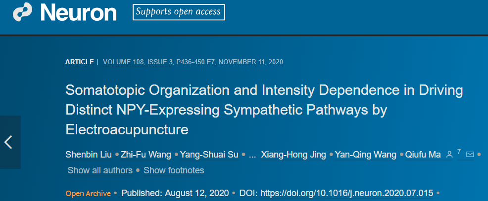 [11] Liu, S., Wang, Z. F., Su, Y. S., Ray, R. S., Jing, X. H., Wang, Y. Q., & Ma, Q. (2020). Somatotopic Organization and Intensity Dependence in Driving Distinct NPY-Expressing Sympathetic Pathways by Electroacupuncture. Neuron, 108(3), 436–450.e7. https://doi.org/10.1016/j.neuron.2020.07.015