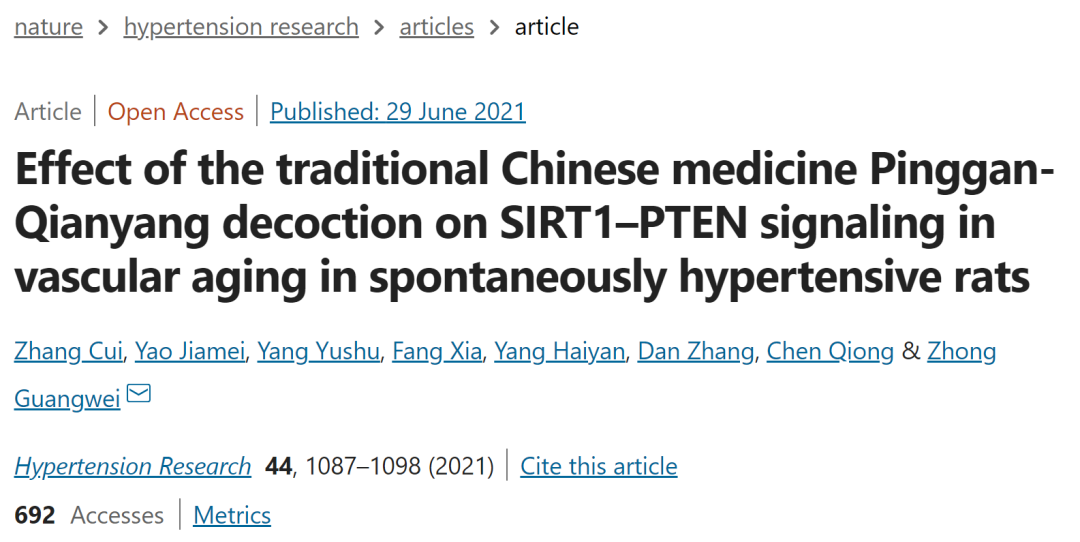 2021年6月,一种名为“平肝潜阳汤”(PGQYD)的中药汤剂登上了国际期刊Hypertension Research,来自湘雅医院的研究人员们发现,PGQYD可能通过调控长寿蛋白之一的SIRT1及关联信号通路,显著改善了高血压诱导的血管衰老[6]。