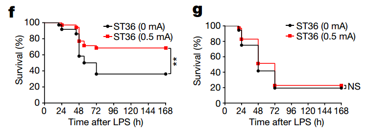 图注:电针足三里降低了小鼠体内炎症水平,并大大延长其寿命