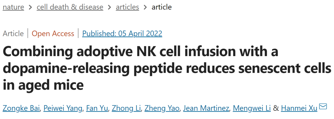[1] Bai, Z., Yang, P., Yu, F., Li, Z., Yao, Z., Martinez, J., Li, M., & Xu, H. (2022). Combining adoptive NK cell infusion with a dopamine-releasing peptide reduces senescent cells in aged mice. Cell Death & Disease, 13(4). https://doi.org/10.1038/s41419-022-04562-w