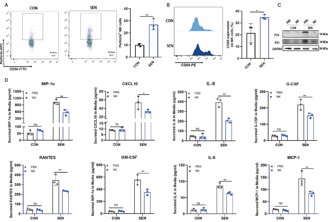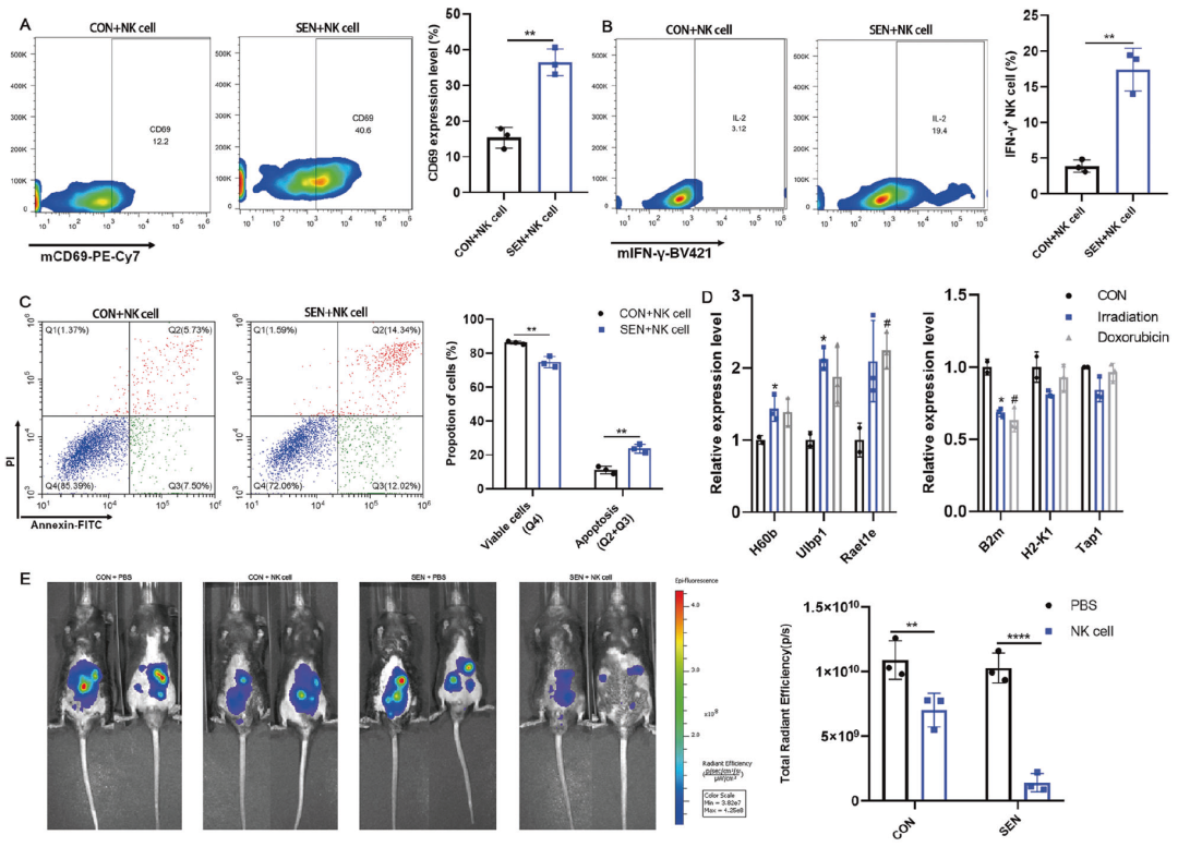 为探究这一问题,学者们选择了已有一定研究基础的NK细胞(自然杀伤细胞),将其与小鼠衰老的脂肪祖细胞(幅射或阿霉素诱导)共同培养,发现衰老细胞可能通过上调免疫应答中的活化分子(MHC I产物)[12],激活了NK细胞(标志物CD69、IFN-γ等表达上升),随后NK细胞“履行职责”,大幅促进了衰老细胞的凋亡。