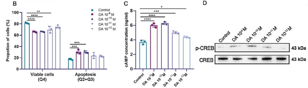 当研究人员尝试添加不同浓度的多巴胺,与小鼠NK细胞、衰老肌肉细胞共同培养,发现多巴胺可通过上调其受体D1,增强NK细胞对衰老细胞的杀伤效果,并在一定范围内存在剂量依赖性(试验中表现出的最佳浓度为10^-9 M)。