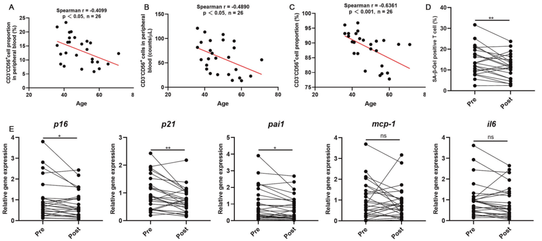 小鼠试验如此成功,那么人体临床又如何?为此,学者们招募了26名健康的成年男性与女性受试者(年龄从36-71岁),为他们进行了自体NK细胞回输。虽然NK细胞的纯度因年龄变化存在很大差异,但在细胞回输后,受试者体内衰老CD3+ T细胞比例以及多项炎性指标均被显著改善。