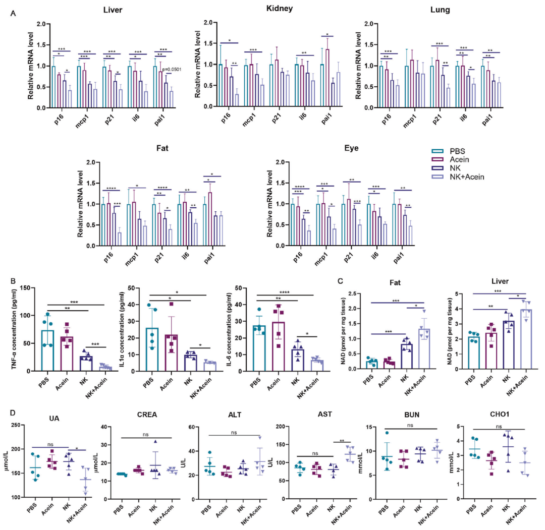 “加强版”NK细胞回输后,阻碍延寿大业的衰老细胞终于被“打扫干净”,四个月后,再次测试这群小鼠,更是证实了联合疗法对小鼠衰老状态的绝佳逆转效果:多个组织(肝脏、肺、肾脏、脂肪组织和眼睛)中,衰老标志物p16、p21和SASP(衰老相关分泌表型)等表达被改善,以及机体必不可少、随衰老显著变化的关键辅酶NAD+含量也在明显增加。