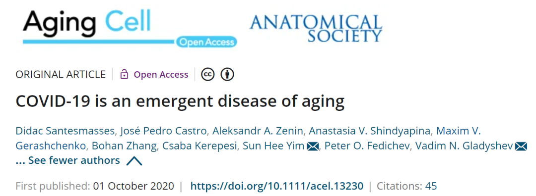 [4] Santesmasses, D., Castro, J. P., Zenin, A. A., Shindyapina, A. V., Gerashchenko, M. V., Zhang, B., Kerepesi, C., Yim, S. H., Fedichev, P. O., & Gladyshev, V. N. (2020). COVID-19 is an emergent disease of aging. Aging cell, 19(10), e13230. https://doi.org/10.1111/acel.13230