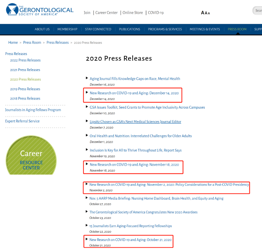 而有着近百年悠久历史的美国老年医学会对新冠更是“穷追不舍”,以“New Research on COVID-19 and Aging”(关于新冠与衰老的新研究)为主题的系列新闻资讯,直接从年头更新到了年尾[6]。